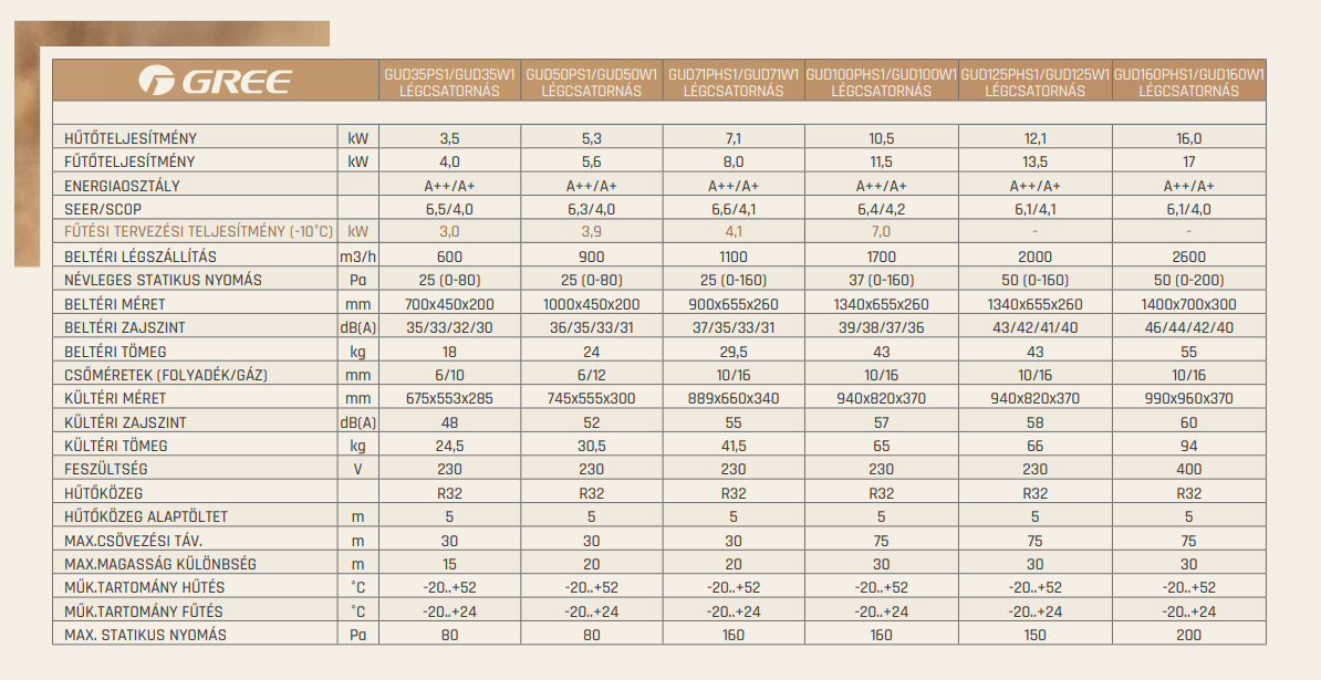 A Gree GUD125PHS / GUD125W Légcsatornás Split Klíma fontos tulajdonságai: