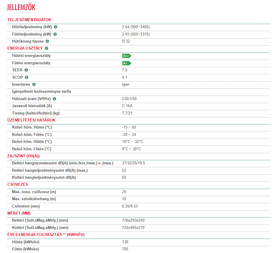 • Hűtő teljesítmény : 2,6 kW